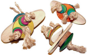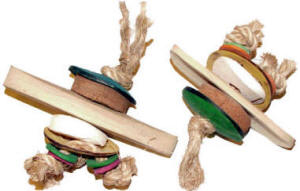The newest addition to our foot toys starts with a natural bamboo center with a cute "face" on one side and a tail on the other! The "face" and "backside" are a colorful coconut shell with coconut fiber on one side and cuttlebone on the other, all tied with a natural fiber rope! The face is completed with coconut washers and natural fiber knots for eyes! Scarlet Macaw, Hawaii, is enjoying with the large size Bamboo Beak Bite! Greater Vasa, "Vasa Madda You" aka Maddie, is working on hers, piece by piece! Two sizes available, the medium bamboo center is approximately 5" L x 1-1/2" wide x 1/4" thick and the large is 6" L x 1-3/4" wide x 1/2" thick, tough enough for those mega beaks in your house!