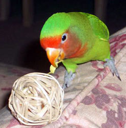 Another variation of our very popular Munch Ball foot toy! The inside of this natural reed ball is filled with sterilized coconut fiber which your parrots will love to shred and munch! These are sure to become a favorite in your house as evidenced by the young Mealy Amazon who was happy to give a demonstration on demolishing a coco munch ball at the Arizona Society of Aviculture Bird Mart in Tucson! Kimo, peachface/fisher lovebird hybrid, is having a great time pulling the stuffing right out of his small munch ball! Stella, Umbrella cockatoo owned by Brenda, is enjoying her large Coco Munch ball! Check out the fiesta munch ball too!