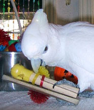 This is such a fun foot toy! Our parrots love all the porcupine shapes, the texture is probably what intrigues them and they really enjoy pulling the pieces off (make sure yours doesn't actually consume these rubbery parts). So we've made this fun little "life's a beach" type toy, looks like he's surfing and enjoying the sun, doesn't it? It's so simple to make with a couple of ParroRings, smiley face, clothes peg and bamboo slat! We have all the parts available so you can save some money and make your own toys or buy it already made! Either way, it'll put a smile on your parrot's beak when they get to play with this toy! Cali, Ducorps Cockatoo pictured above left, loves those ParroRings and Major Mitchell Cockatoo, Ohana, pictured above right, is turning her toy into toothpicks (note: she has a musical moon to work on next)!