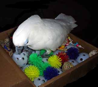 Jumbo ParroPines 2 1/4” Soft Vinyl Jumbo Porcupine Balls (57mm). Assorted colors. (Make certain your parrot does NOT actually consume these!) Riley (U2, pictured above) can't await for her packages to arrive, parront Michelle says that Riley has to just "DIVE INTO" her Busy Beaks' boxes! Just too much fun!!