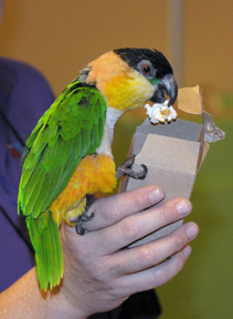 These are a lighter weight box that are good as a component part for a toy of your design or a foot toy. We like to put a scant teaspoon of un-popped corn into the box, place in microwave for about 45-60 seconds (listen for popping to stop, nothing worse than burnt popcorn). Let the box cool thoroughly and give to your parrot! Dennis King was kind enough to take this photo of Cassie the Caique at Parrot Festival enjoying one of our sample boxes that we had filled with popcorn. There's a short, fun video that Dennis did as well on Facebook. Other suggestions include putting clean pre-loved toy parts that still have good chewing left ... or add other wooden parts and/or porcupine balls, etc.! We put whole nuts inside, shredded paper, coconut fiber, ParroTraps, Just Fruit and/or Just Veggies, and tie the box closed (more foraging fun that way) with sisal, leather lacing or leather strips, paulie rope, or cotton rope for a big bird foot toy ... or string several of them together for even more foraging fun! You can nest one box inside one another. Fill the smaller box with some shredded paper, popped corn, a walnut or some other special treasure, then put that a larger one and so forth! The only limitations to what you can do with these boxes is your imagination! Go crazy ... your parrot will love you for it!