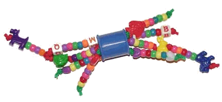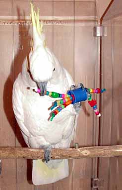 This is a great toy for your parrots that love to snap beads! The center is a large (1-1/2") plastic spool and there are four legs on each side with different shapes and textures, strung on Paulie Rope! Greater Sulfur Crested 'too, Sydney, loves this toy and when he was done popping the beads, I just restrung the spool with Paulie Rope and added more beads!