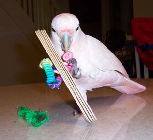 There's a brightly colored smiley face on top of several extra large ParroPops (craft) Sticks, wrapped together with a parrot loving favorite, the ParroPine Ring. The large sticks have been drilled and a ParroLace (curly lace) threaded through with a couple of wooden beads to hold it all together. Whew!! This is certain to put a smile on your parrot's beak. As you can tell from Goffins Cockatoo, Grommet, every part of this toy offers beak pleasing fun!