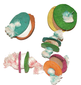 These are great little foot toys that you don't have to tell your FID is actually good for them! You get TWO for one price, The outer shells are colored coconut and the center is either coconut fiber or cuttlebone, sandwiched together with 100% cotton rope. You get one each (same size) for one price! Good fun and a great value too! What a deal!