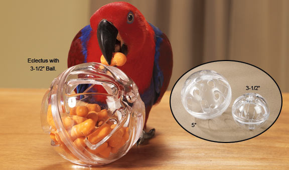 The Foraging Ball arrives empty and ready for you to fill with your parrots favorite goodies. Offer only dry, healthy treat foods in feeders, empty them often to avoid spoilage! You can wash all acrylics in one part bleach, 3-4 parts water, rinse thoroughly and air dry!