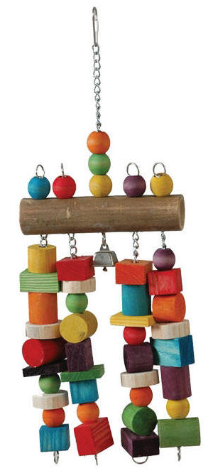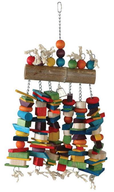 There is a whole lot of chewing fun in the Bamboo Log parrot toy designed for the BIG beaks in your feathered family. A durable bamboo log is the focal point of the toy. Both are strung on nickel plated welded chain, with nickel plated quick link for easy hanging and have multiple "legs" of colorful mixture of hard and soft woods. There is a bell in the center for added fun. A good choice for the mega beaks in your house!
