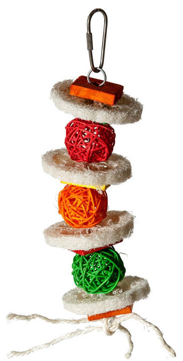 This is so cute! There are slices of Loofah, separated by colorful wicker balls with some layers wood wooden slices in-between. The Meatball Sandwich can be "dressed up" by adding some goodies to the wicker balls (i.e., shredded paper, nuts, pellets, etc.) to encourage foraging. Strung on nickel plated wire and topped with a nickel plated quick link for easy hanging. Great toy for the smaller to mid sized beaks in your life!