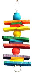 Colorful, chewy pine slats and shapes strung on nickel plated welded chain and topped by a pear shaped nickel plated quick link for easy hanging. Shredable, destroyable, affordable ... perfect for your smaller to mid sized beaks!