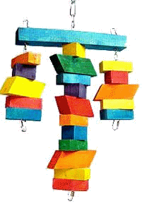 A nice balanced toy with lots of colorful, geometrically cut pieces to keep your mid to larger sized busy beak happy! Three legs of colorful, chewy pine are strung on nickel plated welded chain, hung from a colorful pine center and topped by a nickel plated quick link for easy hanging. Shredable, destroyable, affordable ... perfect for those larger beaks in your house! (If you like this toy but have a smaller beak in your house, be sure to check out Tsadoq!)