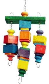 A nice balanced toy with lots of colorful, shaped pieces to keep your mid sized busy beak happy! Three legs of colorful, chewy pine are strung on nickel plated welded chain, hung from a colorful pine center and topped by a nickel plated quick link for easy hanging. Shredable, destroyable, affordable ... perfect for those mid-sized beaks in your house! (If you like this toy but have a larger beak in your house, be sure to check out Topaze!)