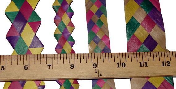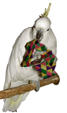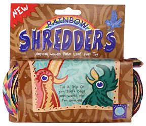 Brand new! The natural Planet Pleasures shredders have a new look ... colored and a larger size too! All the same wonderful attributes of the natural shredders apply to these colorful additions ... pesticide free, veterinarian and breeder approved, made of a shredable, woven palm leaf. Help prevent feather picking and end bird boredom. These, as well as all of the Planet Pleasures toys, are hand-made by villagers who rely on their handcraft skills to survive. So if finding an inexpensive treat for your feathered family isn't enough satisfaction, you are also directly supporting these low-income people's traditional skills and way of life. Great way to put a smile on your parrot's beak without breaking the bank (as you can see from our GSC2, Chapin, pictured above center). Ozzy (yes, that is a Senegal with her head hidden in the Basket Full of Surprises) is having a great time with this toy.