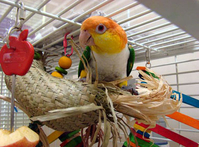 This is just a FABULOUS toy! Our bigger beaks LOVE the original Triangle Teaser and now there's a version for those smaller beaks in your life! Geometrically shaped 1" x 1/2" rectangles of 1/4" thick pieces of soft, chewy wood with a dozen colorful triangle pieces (3" long and 1" wide at the widest part) are just perfect for snipping off the tips. It's all strung on a nickel plated chain with pear shaped quick links on both sides (save the materials and restring with other goodies)! Get creative! Use it as a bridge, hang it vertically, horizontally ... it's a terrific new toy from Super Bird Creations! Caique, Chickie is using Rooster Cogbird as a perch while enjoying some of the tail feathers! Too funny! You can see the mini tri teaser in the background, also nibbled on! Thanks for sharing, Saroj, Chickie is a real cutie! For those big beaks in your life, be sure to check out the original Triangle Teaser!