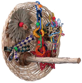 A woven plate is full of lots of chewing fun including ParroTraps, a fiesta ball stuffer, woven star, woven daisy and best of all a cajeput perch! Perfect for the smaller to mid sized beaks in your life! Motivate your parrot's foraging experience by adding some favorite goodies (JUST fruit, JUST veggies, nuts, popped corn, etc.) inside the munch ball! For more perch options ... click here!