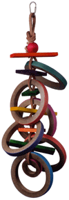 Olympic Rings is simple, fun, lots of beak chewing delight with bagels, wooden slats and a colorful wooden ball all woven in vegetable tanned leather strips! Colorful, shredable fun for your Busy Beaks! There's a quick link on top for easy hanging.