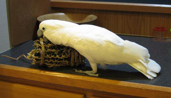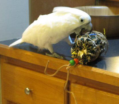 A quick link on top for easy hanging, colorful hanging pods on the vegetable tanned leather strip that is filled with hard plastic beads and colorful wooden slats! The sea grass mat is stuffed full of fun with lots of shredded paper, held together with birdy bagels! This wonderful foraging toy can be easily enhanced with some of your parrot's favorite goodies. Add some whole nuts to the inside of the mat, stand back and watch the fun! Note: Brenda's U2 companion, Stella is really enjoying her (Small/Med) Firecracker! For more foraging options ... click here!
