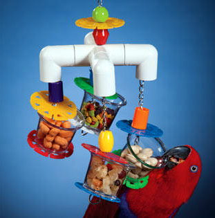 This is a sturdy, foraging toy for the mid to larger size beaks in your house. There are four clear acrylic dangling cups with moveable covers that will move about when your parrot forages for the goodies inside. Helps to develop natural foraging and problem-solving skills in a fun and entertaining manner. Physical agility of your bird is put to the test as this hanging foraging toy tips and teeters in mid-air. Perfect for stimulating their foraging instinct ... suitable for beginner or advanced "foragers". Designed for the mid to larger size (i.e., Amazon, Eclectus, Greys, small cockatoos and mini macaws) parrots in your house.