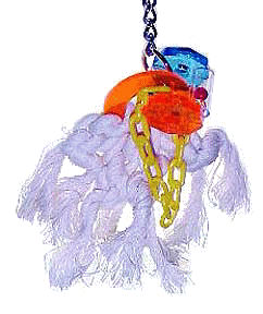 A fun, smaller toy for your feathered companion with lots of 100% tightly knotted, cotton rope for extra beak teasing fun. Small, plastic chain, acrylic cylinder contains beads. A fun toy from Bell Plastics which is durable and long lasting. Attaches to the cage with a pear shaped quick link and nickel plated chain.