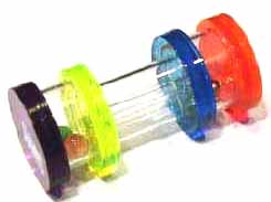 The DOUBLE BARBELL has compartments on top and bottom with marbles and beads-the center is a double tube for easier grip.