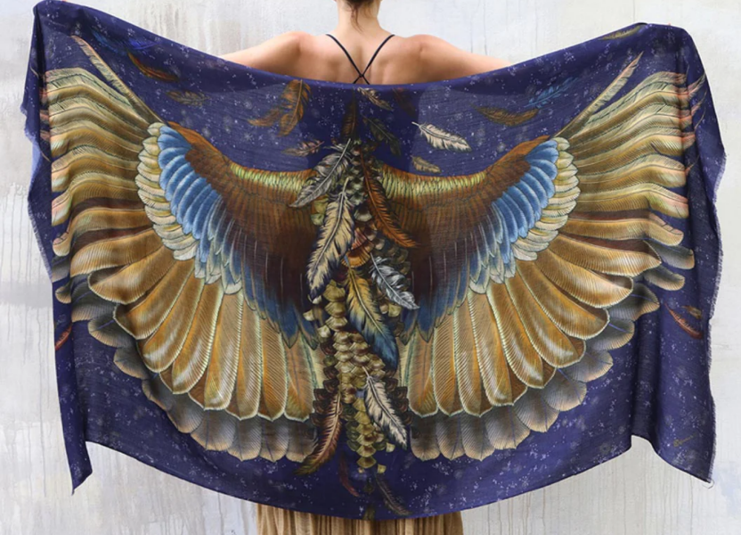 This is 100% certified organic cotton with print on one side, the other side is slightly lighter. This is a sheer matte, light material that breathes and drapes well. Neat edges, two shortest edges have a fray which gives the shawl a bohemian touch. Delicately hand-painted and digitally printed art of "Celeste" Wide-Spread Wings, this highly detailed representation of nature, freedom and beauty is a labor of Love. A beautiful array of colors that work together in fresh unison. What makes this scarf truly amazing is its versatility. It can be worn with both light and dark colors and acts as a standout piece. Just put it over your shoulders to look & feel divine. Shovava Shawls make wonderful gifts for friends, family and yourself! Beautiful Gold shades of color on dark blue background - they are both subdued, feminine and natural. You can see every stroke and watercolor hues. Enjoy delicate gold, browns, blues. Truly versatile, this scarf looks great paired with any outfit, SO many ways to wear it! Classic scarf or shawl, tube top or halter top, as a bandana or turban, sarong or wrap skirt... this piece of Art will protect you from Sun and will add that special something to any outfit. This is a special piece made from delicate soft material so please treat it accordingly: - If you wish to hand wash, immerse the garment and gently rinse. - Don't rub or soak. - Lay flat to dry in shade.