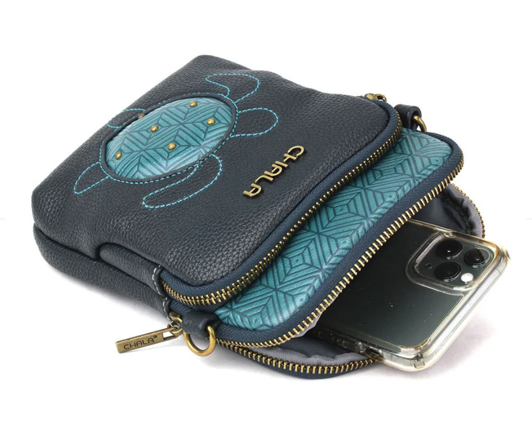 The Chala Uni Cellphone Crossbody is so convenient!! Perfect for when you're traveling "light" when you just need your cellphone, ID, credit cards and a little cash. Click on the photo for bag specifics! Unique, Sophisticated, Fun Small front pocket adorned with Turtle Chala design