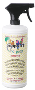 Poop-Off ® is the number one recommended bird dropping remover in the world.  Three years to formulate and three years of testing were needed to guarantee a safe product around all avian species.  The product is so safe it is used by the world famous San Diego Zoo, respected avian breeders and bird lovers. Poop-Off ® contains no-contents that have been found to be dangerous to birds such as chemicals, solvents, orange oil, detergent, citrus fragrances, alcohol or bleach.  Safe to use with the bird inside the cage. Non-Toxic & Bio-Degradable.