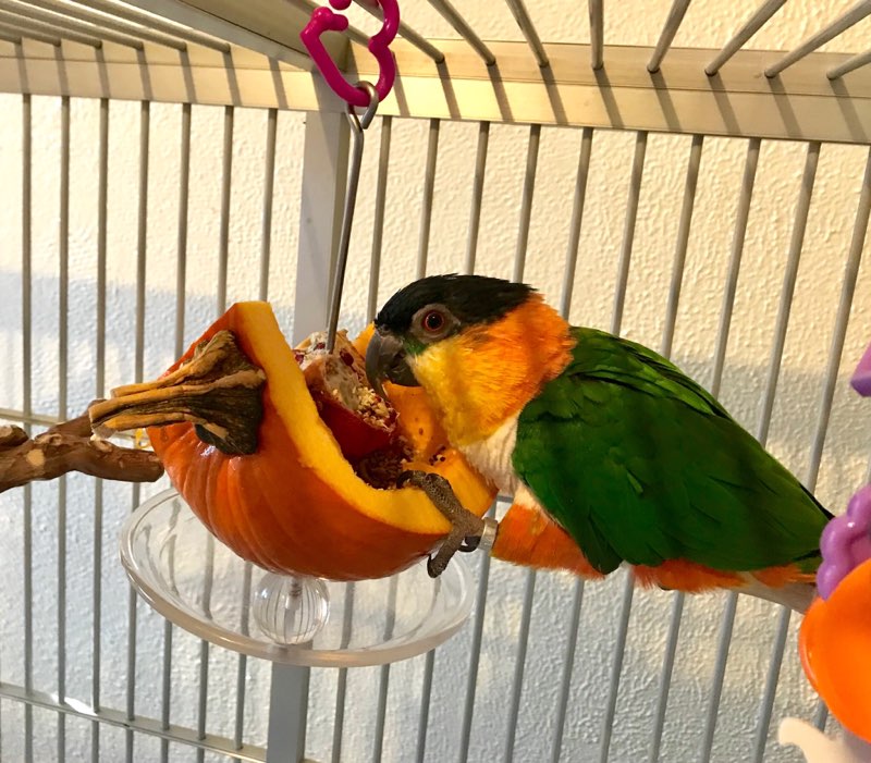 giving him a partial pumpkin (as a bowl) and a messy pomegranate is inside